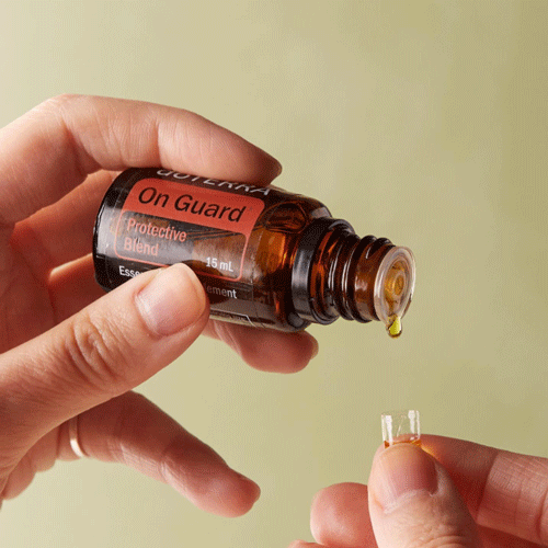 - Add one drop of OnGuard to 5 drops of carrier oil. Rub your hands together and touch your thumb to the roof of your mouth and your index finger to under your tongue. (This is a quick way to get the benefits of the oil absorbed into the blood stream.)